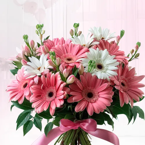 • Премиум ( гербера - 11 шт., альстромерия - 8 шт., зелень, упаковка, лента)