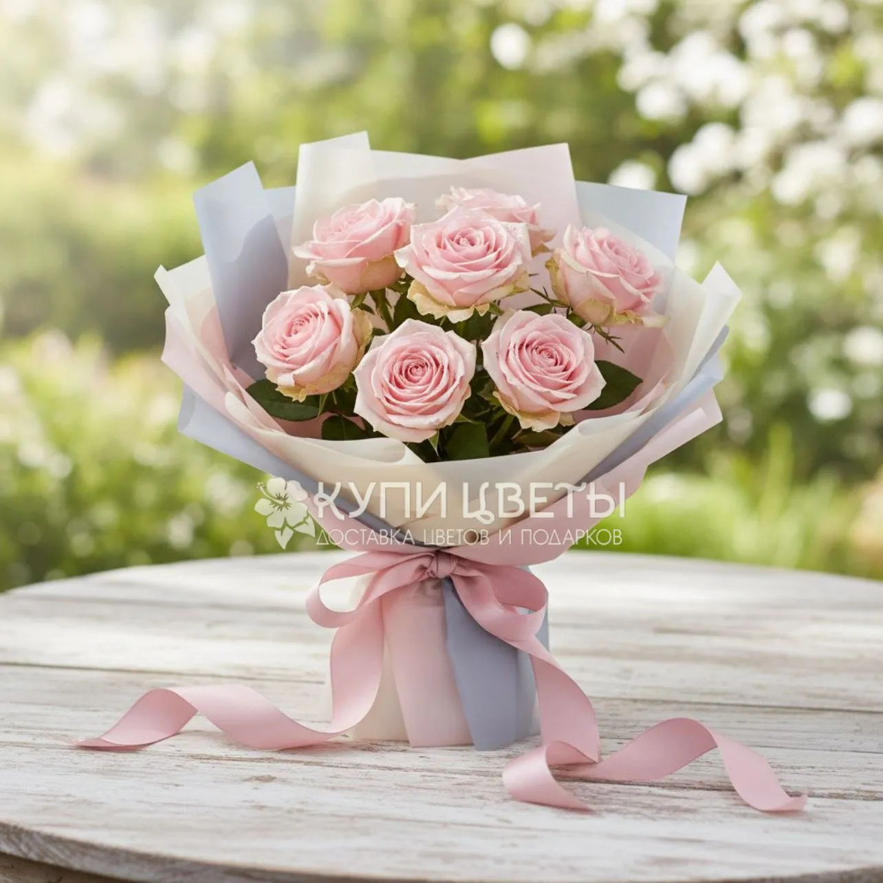 Розовые розы 7 шт., упаковка, лента