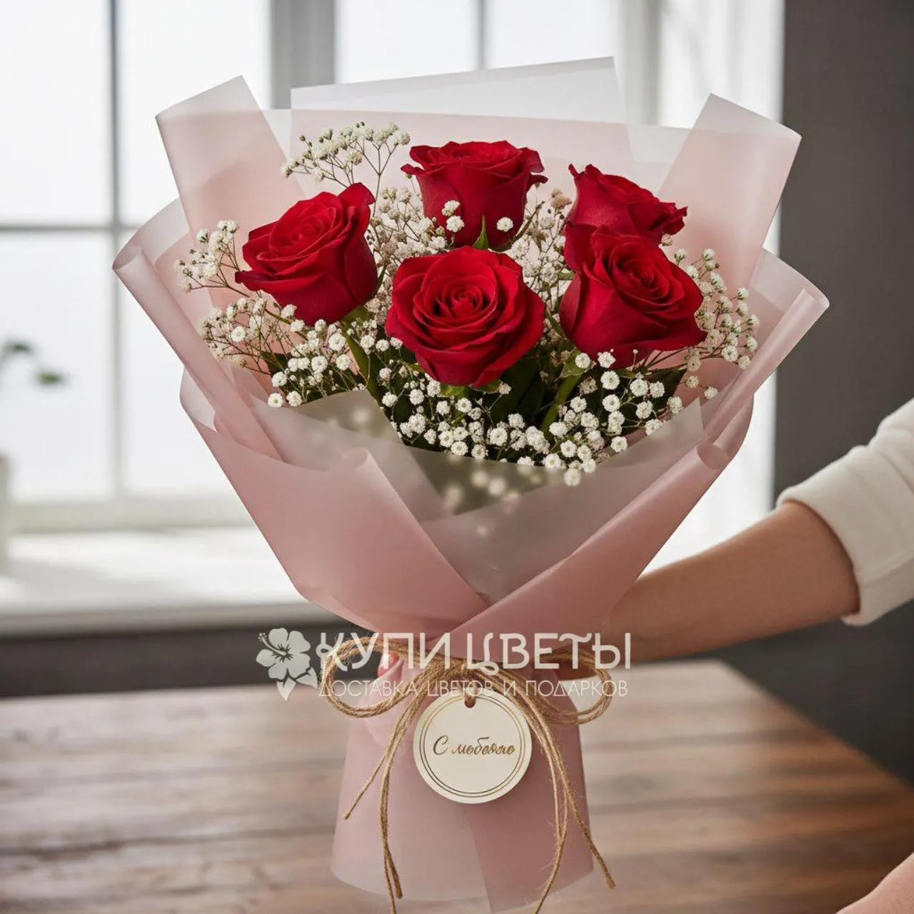 когда страсть встречается с нежностью, рождается волшебный букет из 5 красных роз с гипсофилой. Пылающие сердца роз, окруженные сияющей дымкой гипсофилы, рассказывают историю безграничной любви и чистых намерений. Этот изумительный подарок – символ преданности и красоты, способный растопить любое сердце.
