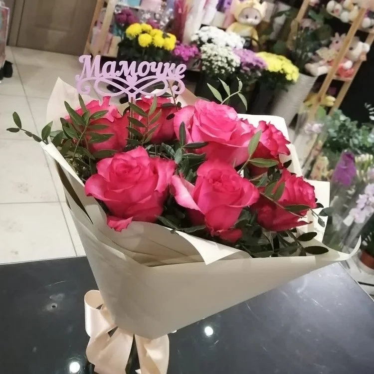 • Средний - роза - 9 шт., зелень, топпер, упаковка, лента