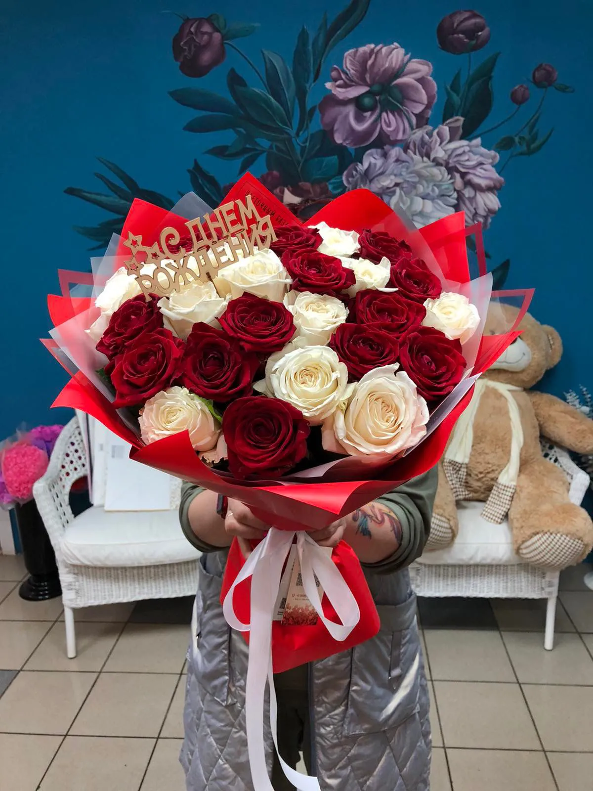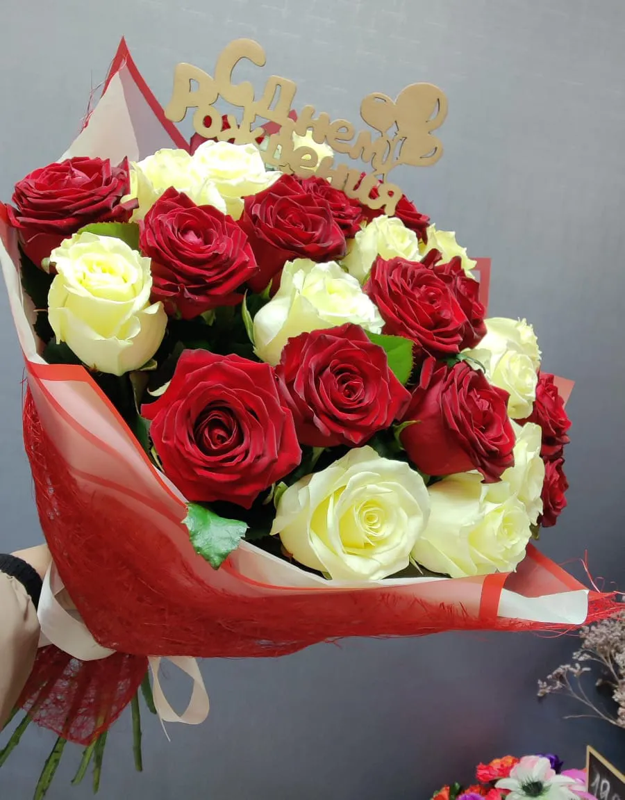 Букет из красных и белых роз День Рождения