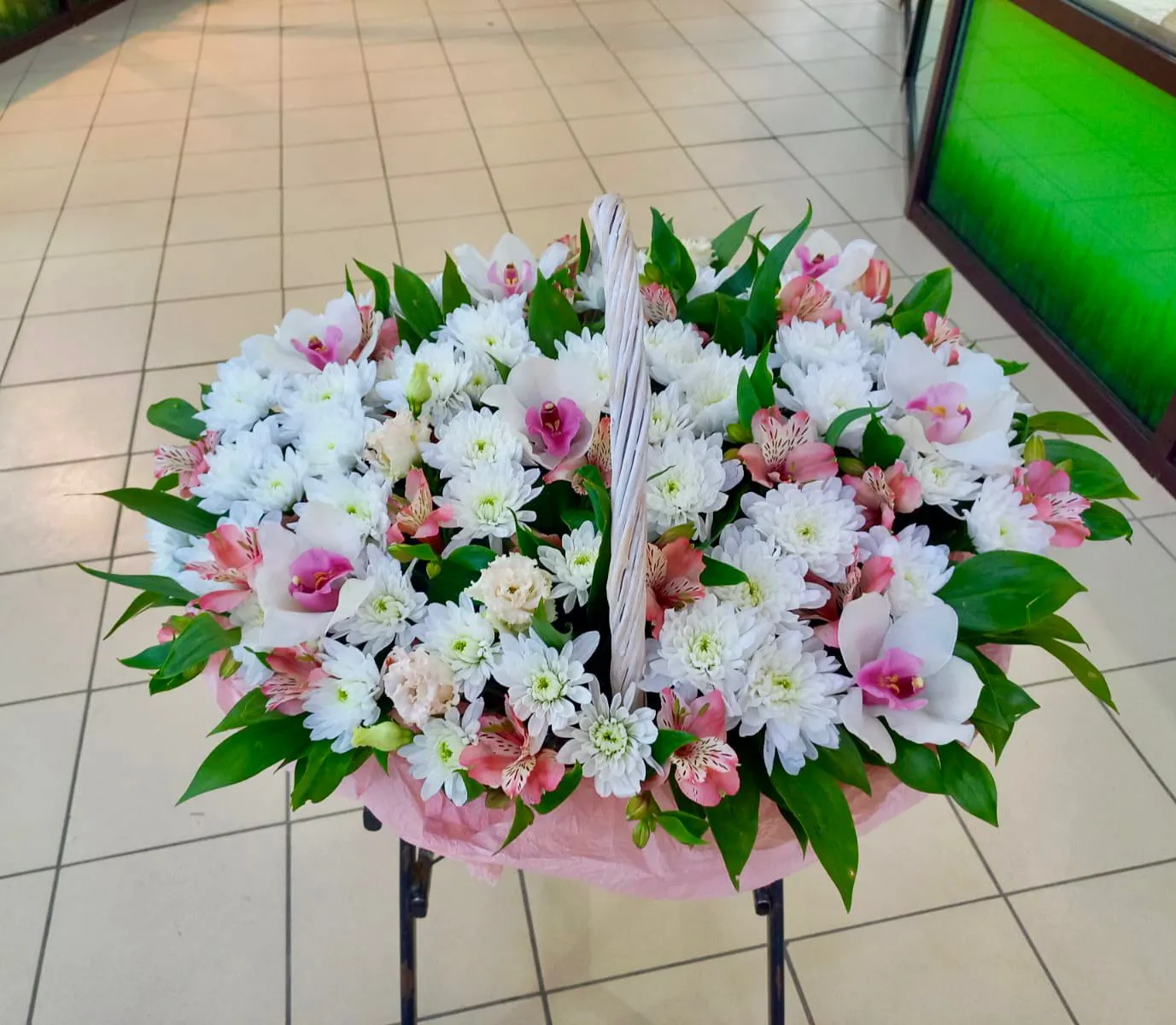 хризантема кустовая ,орхидея цимбидиум бутон, кустовая роза, лизиантус,зелень, оазис, корзина