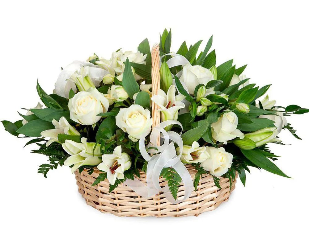 Вариант—Стандарт - роза - 5 шт., лилия - 3 шт., альстромерия - 5 шт., зелень, оазис, корзина