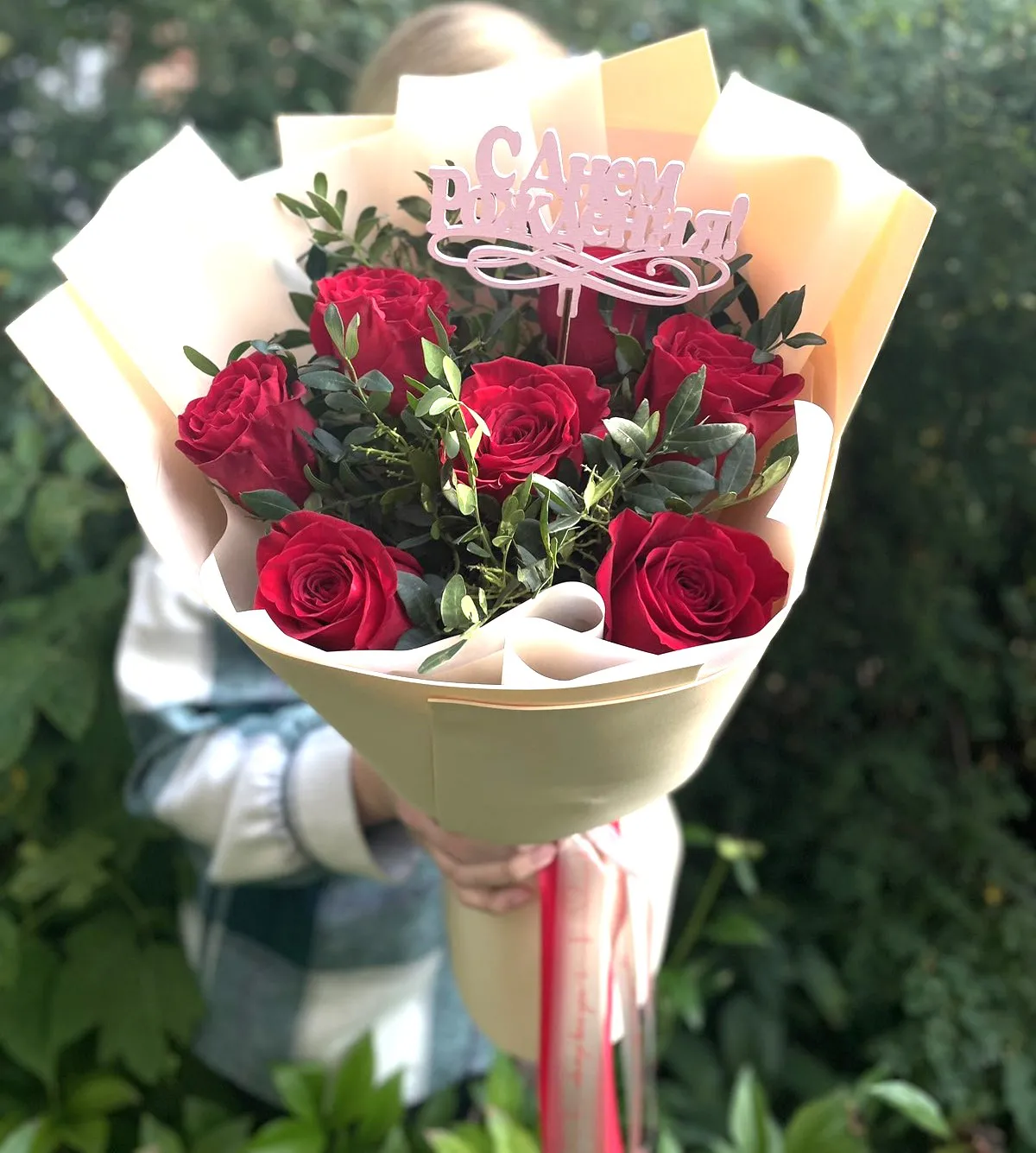 Листва, словно мягкая вуаль, обрамляет каждую розу, подчеркивая их красоту и добавляя свежести. Аромат, исходящий от этого букета, сладок и съялен, наполняет атмосферу нежностью и радостью. Идеально подходит в качестве подарка на день рождения, этот букет станет ярким акцентом и создаст атмосферу праздника. Подарите своим близким этот чудесный символ любви и уважения!