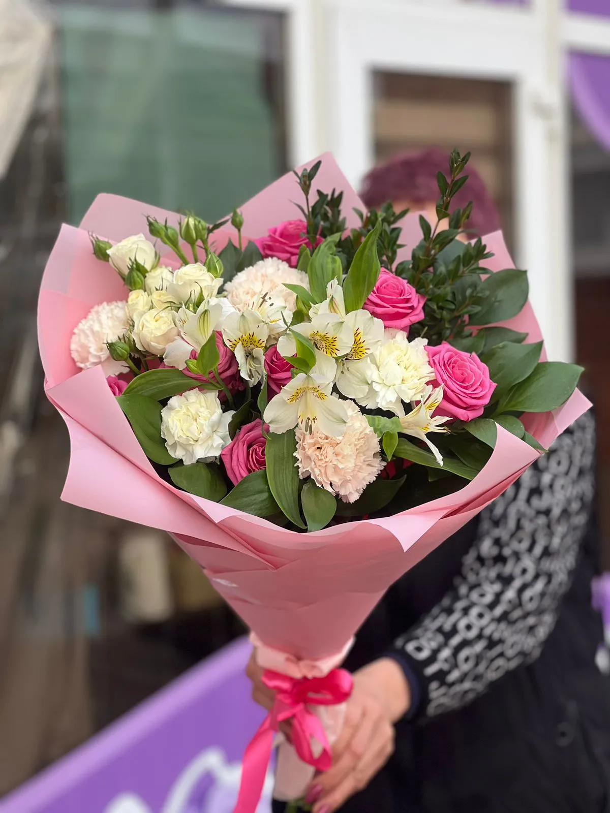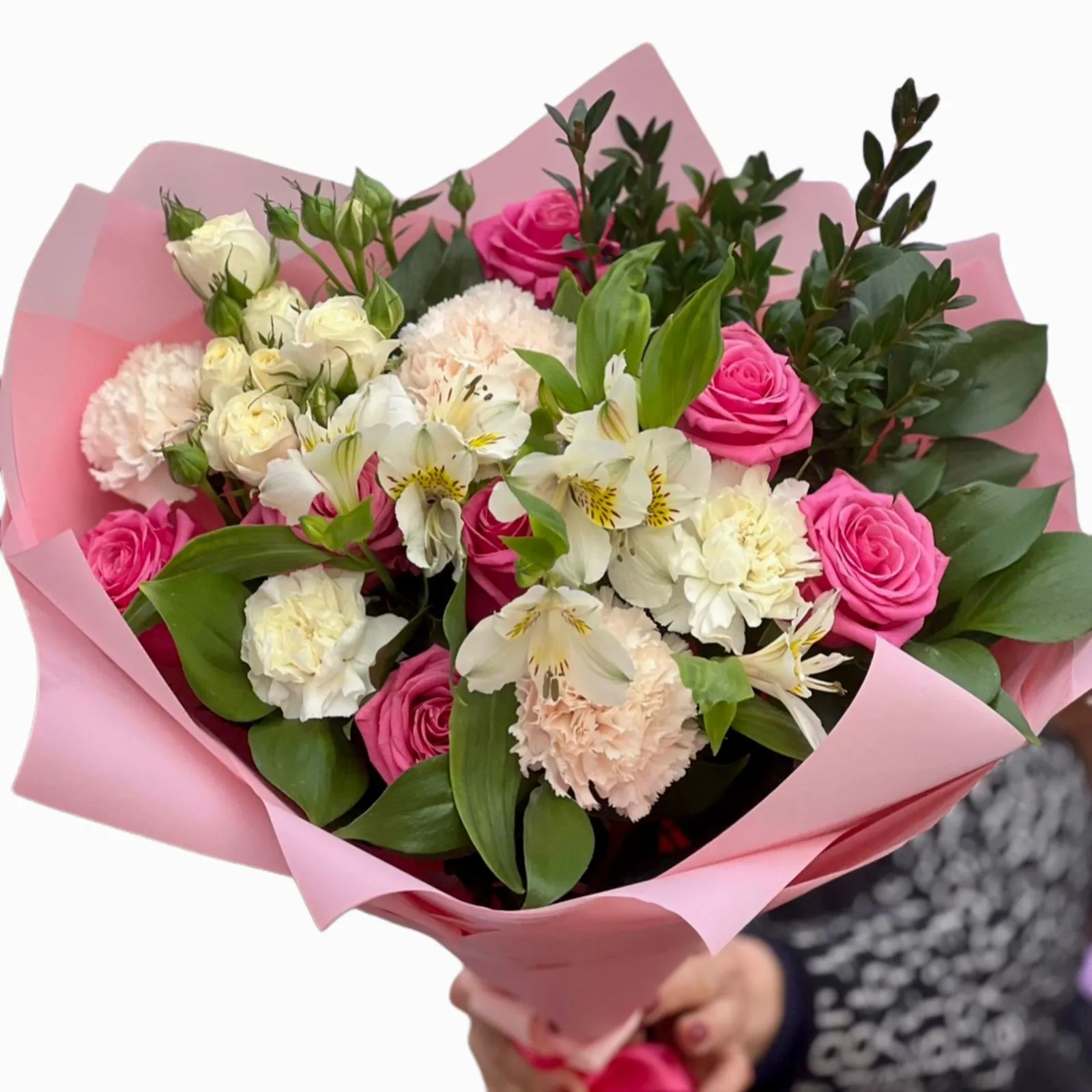 Роза, кустовая роза, гвоздика,альстромерия , зелень, упаковка, лента