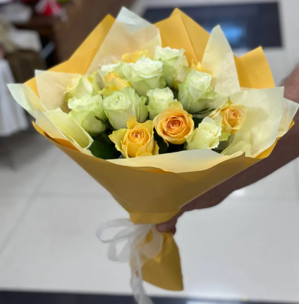 Простой, но трогательный букет из белых и желтых роз – это послание, понятное без слов