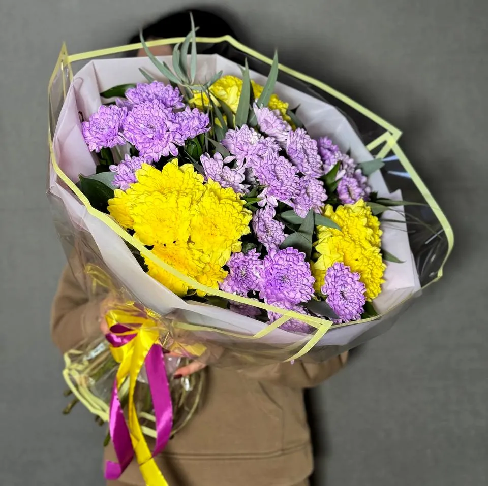 Удивите своих близких уникальным букетом из желтых и фиолетовых хризантем, чтобы передать свои чувства и пожелания в этот прекрасный цветочный язык!