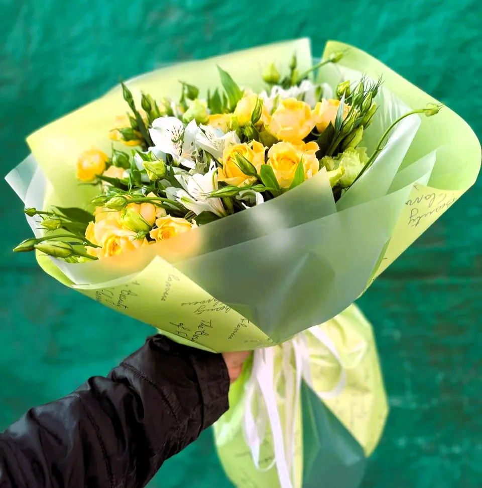 • Средний - кустовая роза - 5 шт., альстромерия - 7 шт.,упаковка,лента