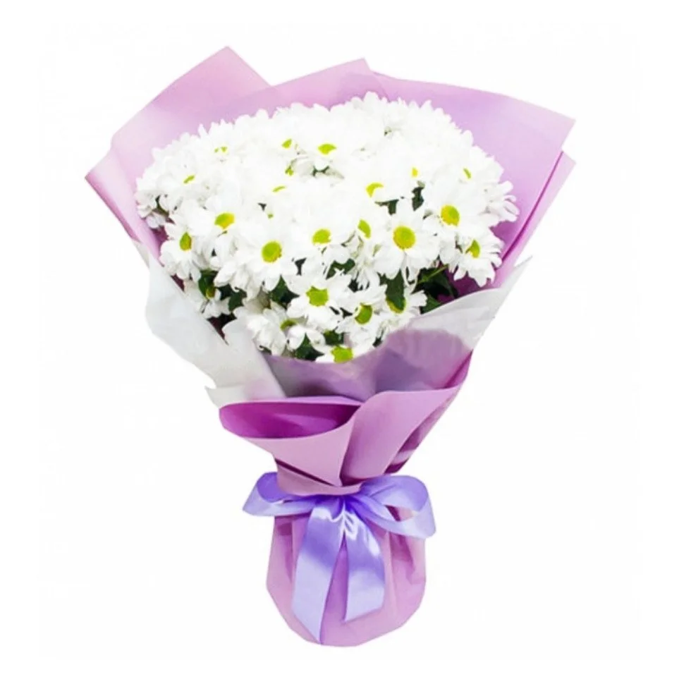 Состав букета: белые ромашковые хризантемы, упаковка, лента