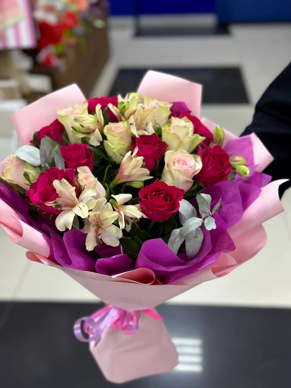 Розы,альстромерии,зелень,упаковка,лента
