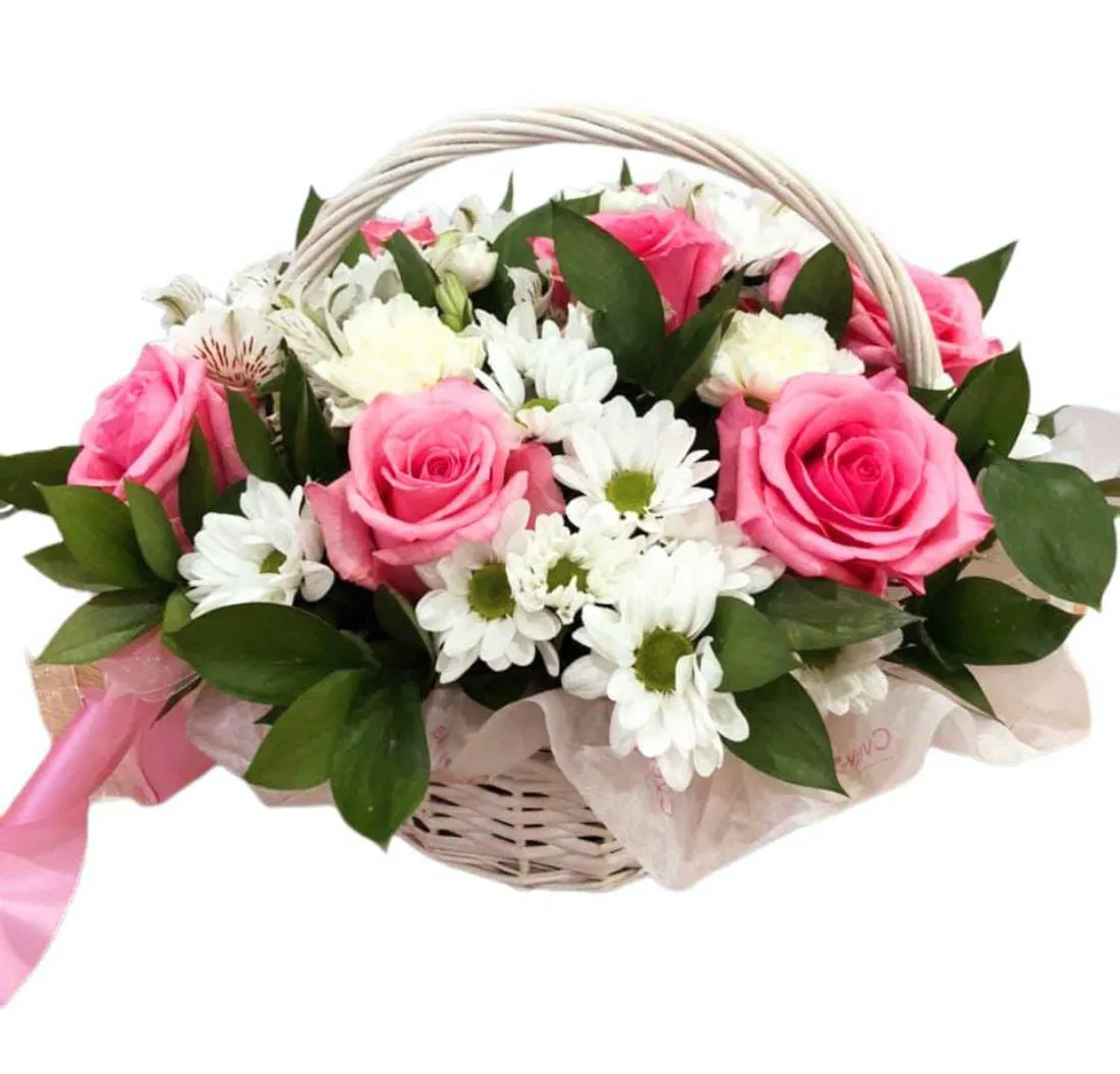 Вариант—Стандарт - роза - 5 шт; кустоые хризантемы - 3 шт; альстромерии 2 - шт; зелень, корзина, оазис